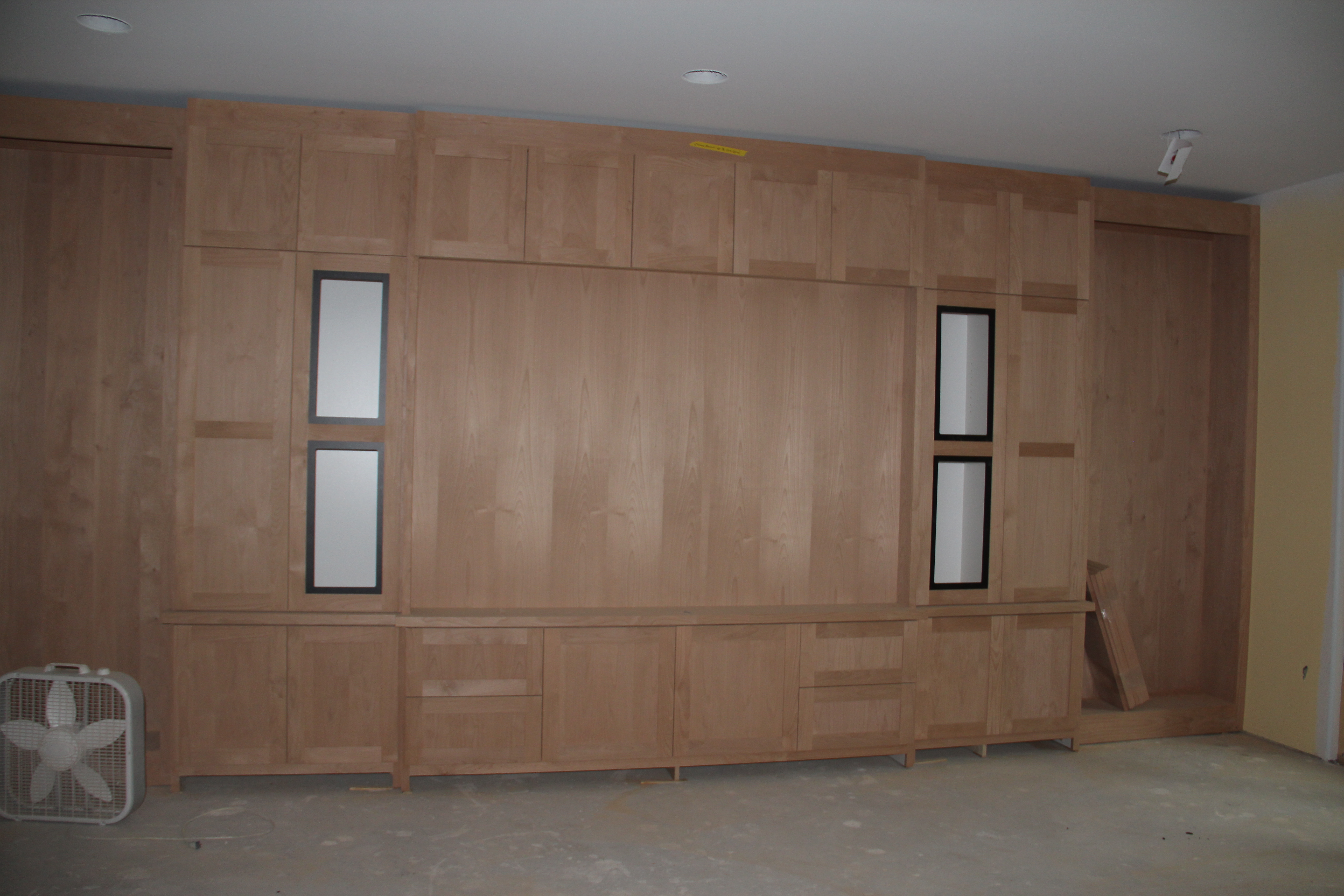 The basement cabinets. The white rectangles are where speakers and speaker cloth will be. The empty spaces on either end will be bookshelves.