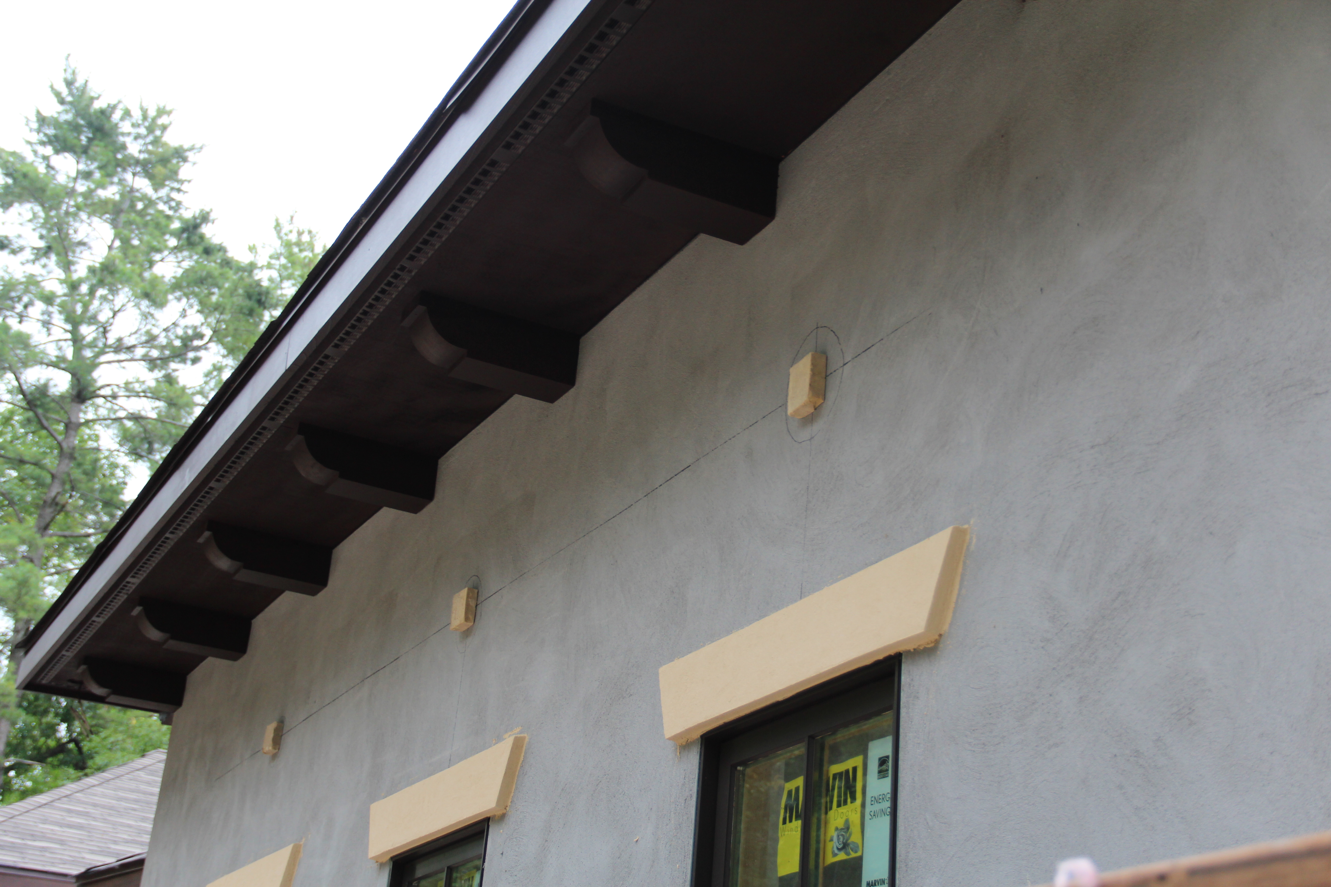 The wood trim has been stained (those decorative pieces under the eaves are called lookouts). Hopefully by this tie next week we won’t see the grey stucco anymore!