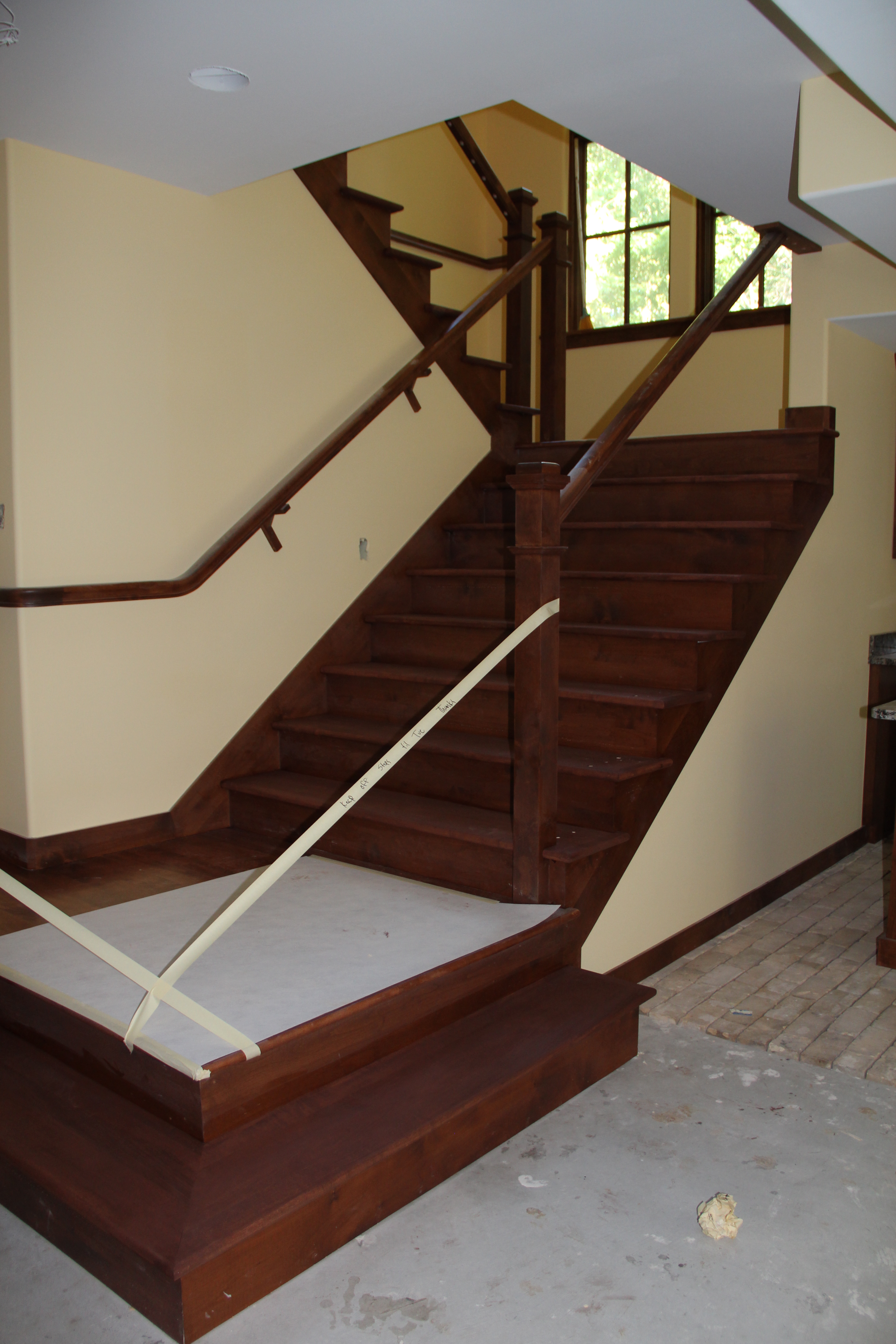 The stairs are now stained.  Next week the carpet runner goes on and the metal spindles are installed