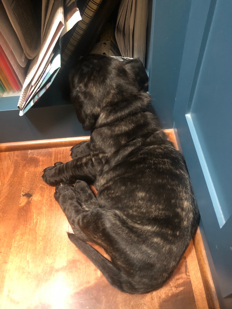 Both dogs have continued their character traits at their new homes. Thimble likes to sleep (a lot) and sleeps under things as much as possible. At my house, her fave space was under my desk. Her adopters report she likes to squeeze into quiet corners for some shuteye. If that doesn’t work, she has been known to crawl under a pillow and snooze! Thimble lumbers about like a happy, over-served bar patron. Her squat legs don’t quite seem up to the task of holding her girth upright. And her wrinkles are getting jowlier, and the drooling has commenced. (Can dogs wear bibs?)