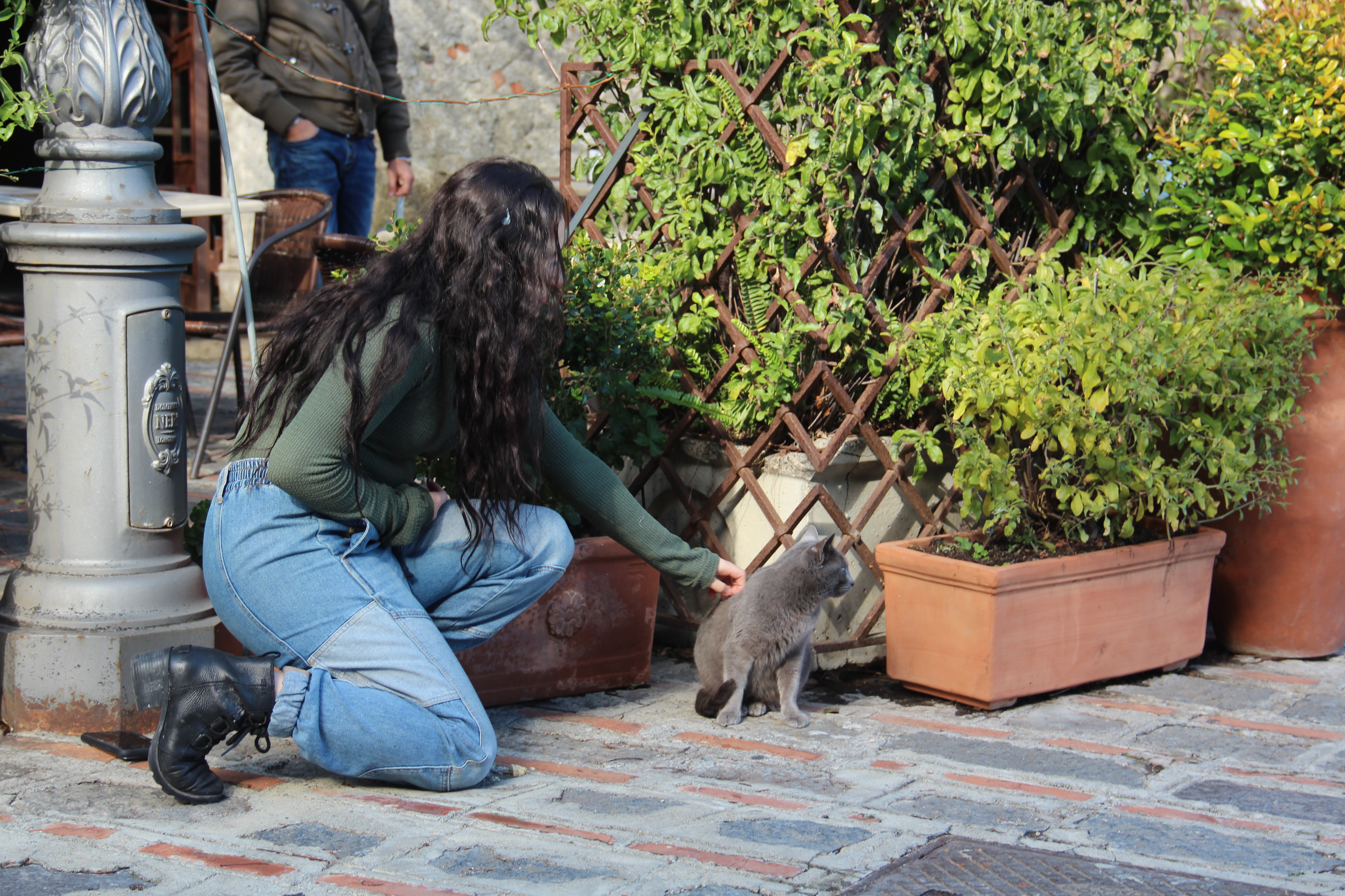 …then directed us to wait in front of a shop. Singer Girl took the opportunity to make a local feline friend…