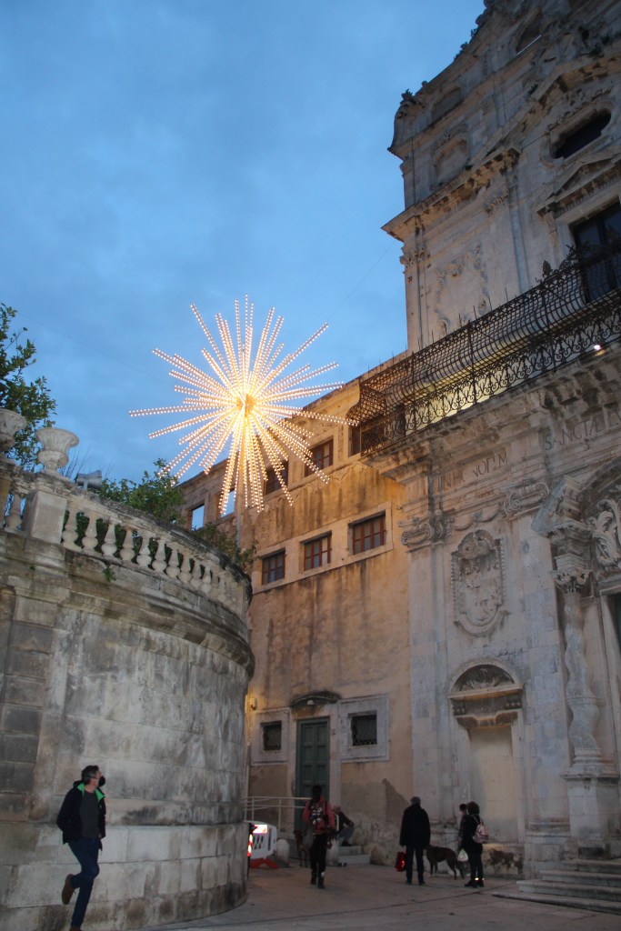 So just a quickie about our Christmas celebrations in Sicily. As previously mentioned, we moved to Sailor Boy’s place for the holiday. We didn’t stay with him the whole time in Catania simply because he lives on the third floor, with no elevator, and, well HWSNBN can’t do stairs anymore. It took all three of us to get him up those steps. Singer Girl and Sailor Boy alternated schlepping luggage, steadying Dad from the front, and racing upstairs to turn the motion sensor lights back on (did I mention we moved very slowly?). I stood below, lifting each foot up each stair, left right step. Left right step. So yeah: it was a team effort.