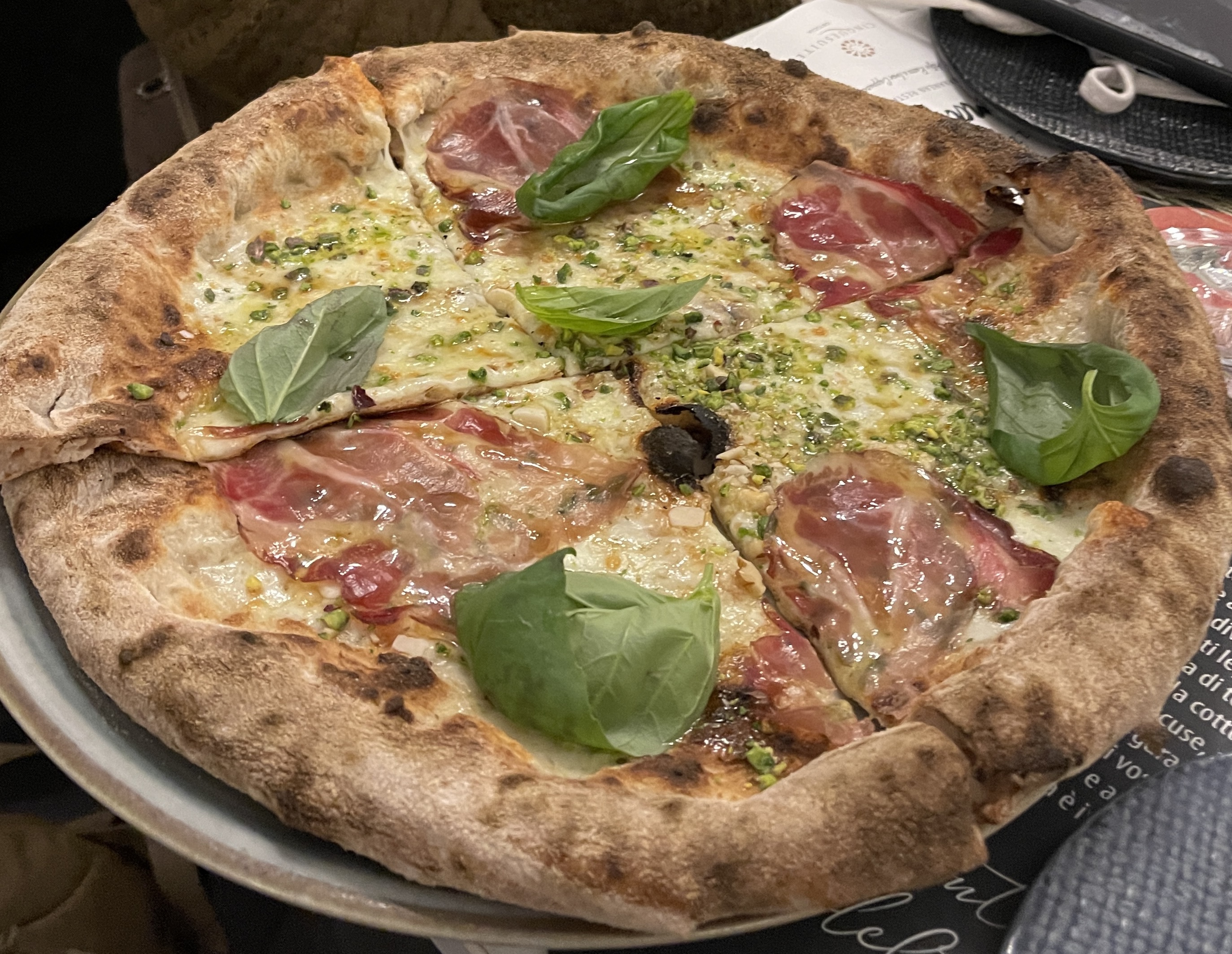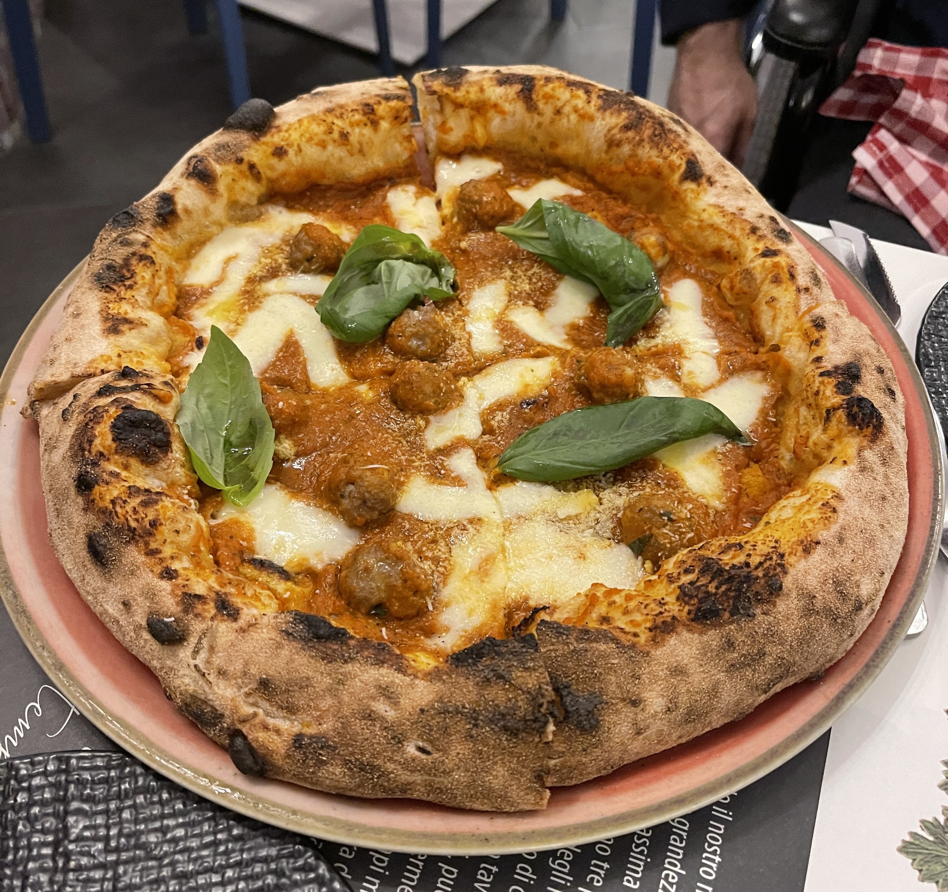Dinner that night was our farewell to Sicily — and Sailor Boy. He was driving back after the meal, as he had to be back on duty early the next morning. We went to another place where we were the first in the door, and where the steps were steep. No problem! In typical Sicilian fashion, a few waiters scurried out and carried HWSBNB up the stairs, wheelchair and all, lol. The restaurant, Anima e Cori, was a pizza place — the first pizza we had had on the trip I think. It was fun, it was casual, there were strolling accordion players and, frankly, many out of towners. But it didn’t feel touristy — it had been highly recommended, and we enjoyed it thoroughly. Our only regret was only ordering 2 pizzas, because the menu was amazing! Our fave reminded me of one HWSNBN and I enjoyed in Colorado the previous year, as it included honey as a topping. Still weird to wrap my brain around, but man is it good with the right crust and toppings!