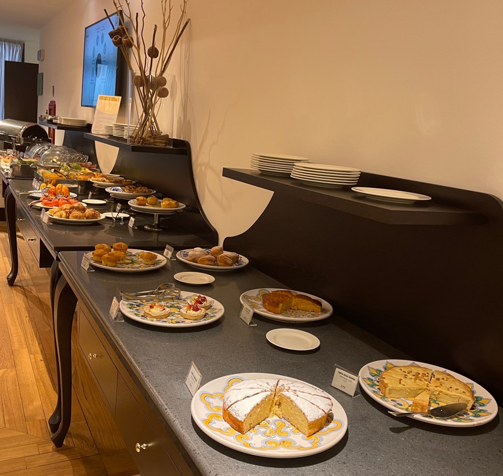 HOtels in Europe do the free breakfast thing waaaay better in the states. I popped down in the AM and brought up a plate for HWSNBN. Here’s a really underwhelming pic of the buffet, which had cakes, pastries, meats, cheeses, fruits, veg and more.