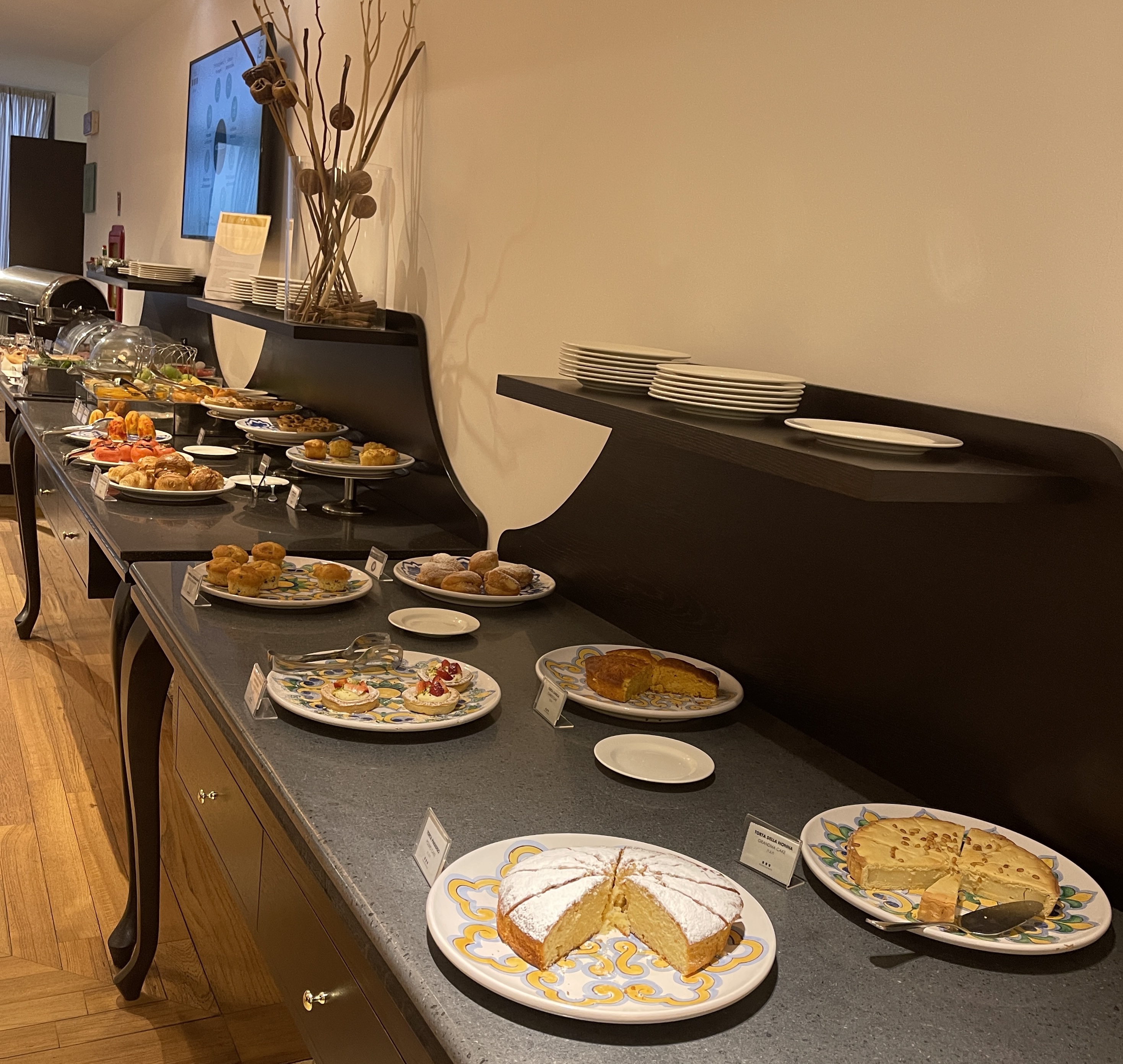 HOtels in Europe do the free breakfast thing waaaay better in the states. I popped down in the AM and brought up a plate for HWSNBN. Here’s a really underwhelming pic of the buffet, which had cakes, pastries, meats, cheeses, fruits, veg and more.