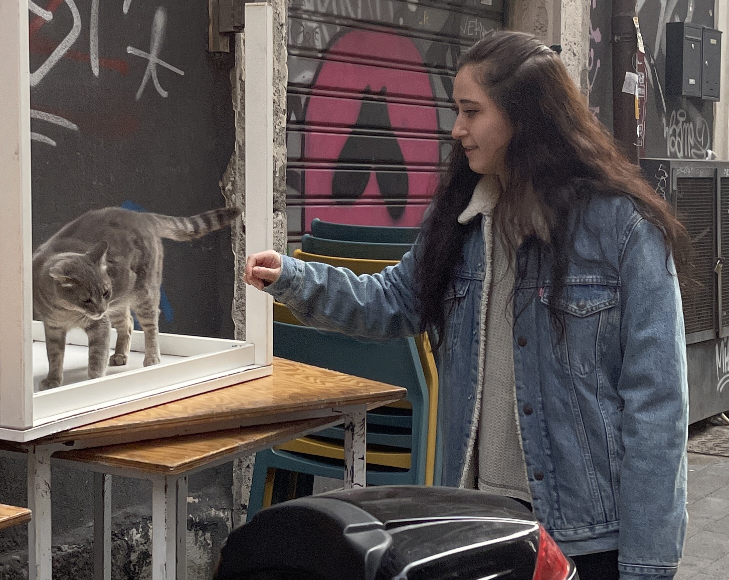 …then directed us to wait in front of a shop. Singer Girl took the opportunity to make a local feline friend…