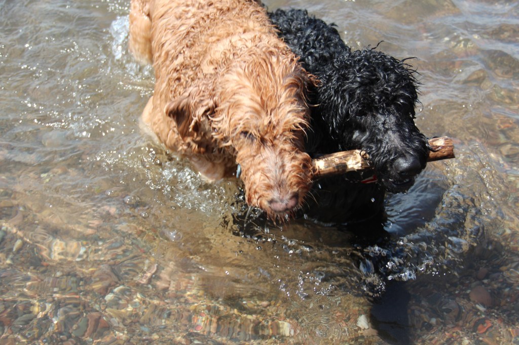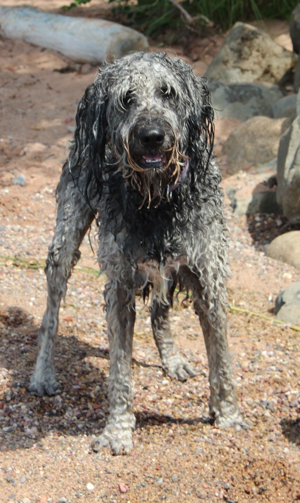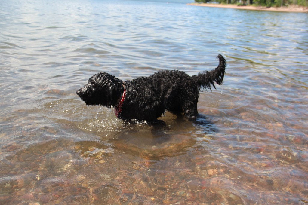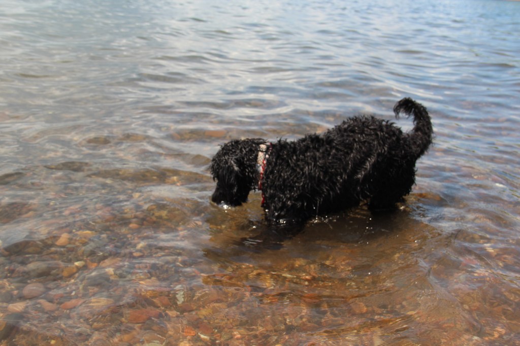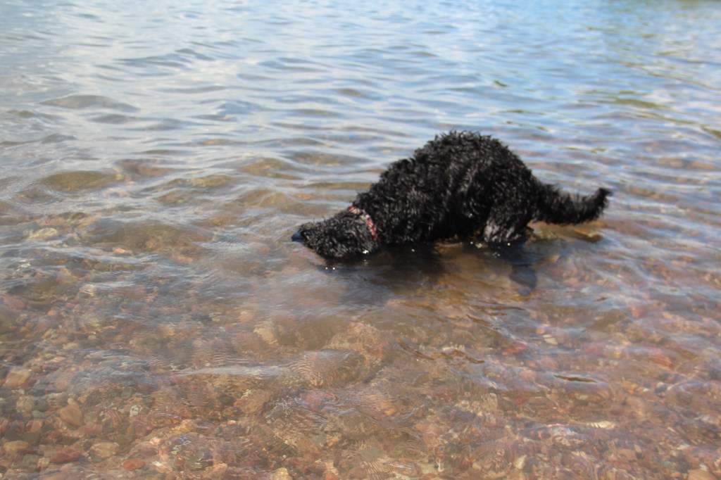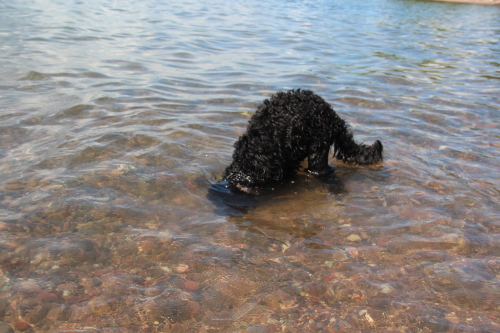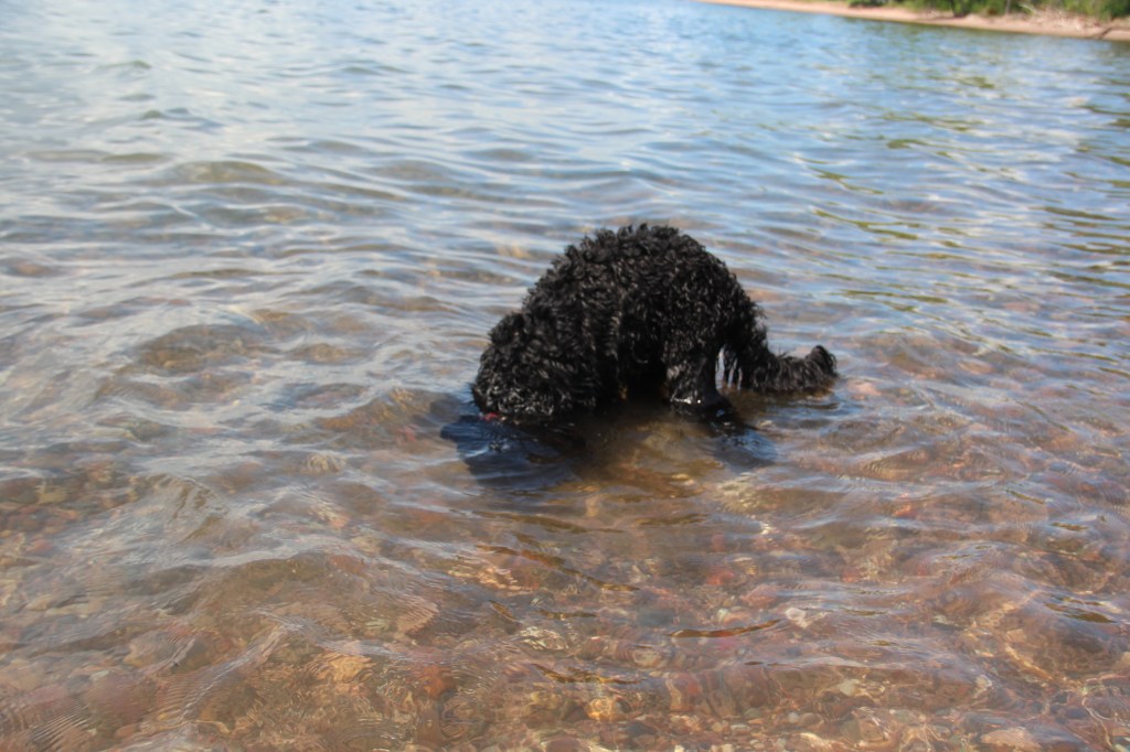 Lyle, the black doodle above, has a neat trick: he likes to dive for rocks. We didn’t understand at first, but as you’ll see in the following slideshow, he likes to sort through the rocks underwater with his paws, and pull one where he can get it, then sticks his head underwater!