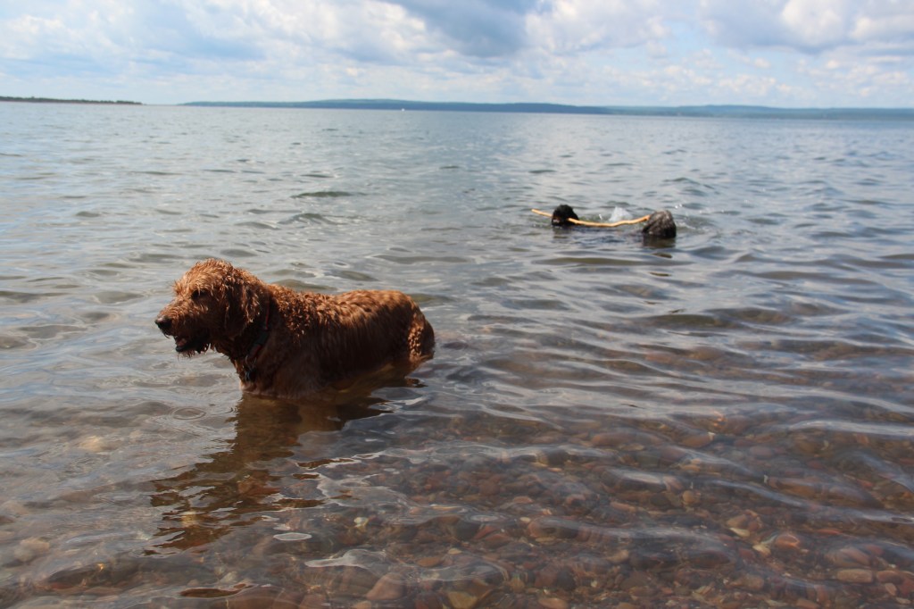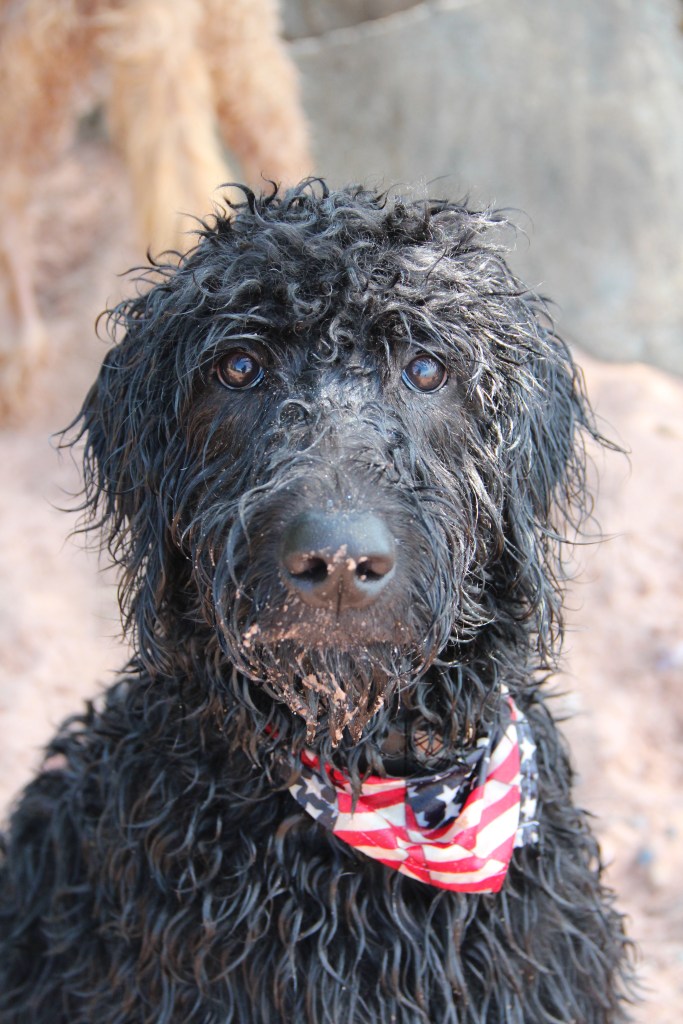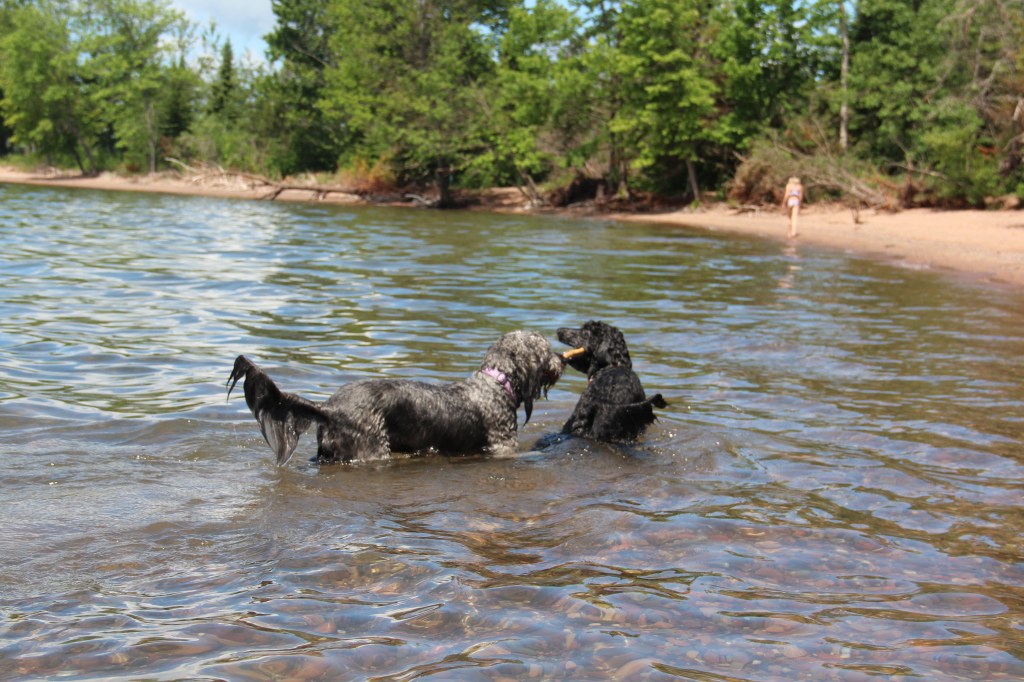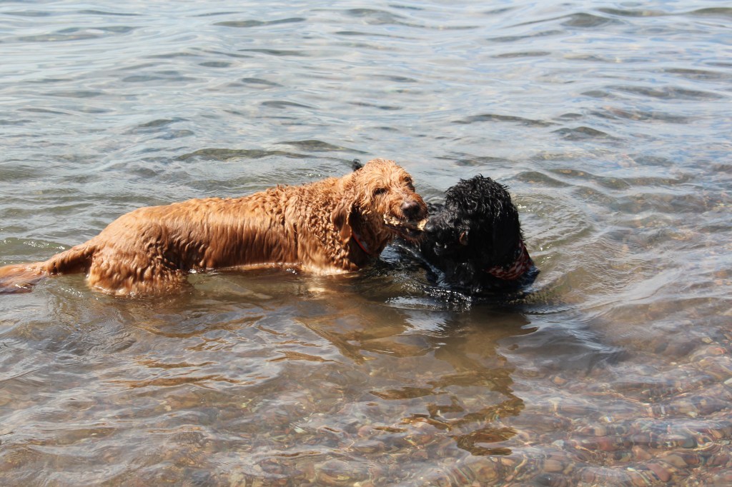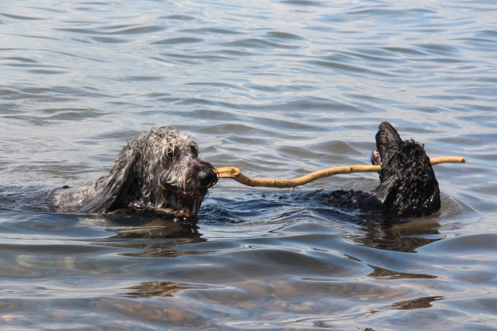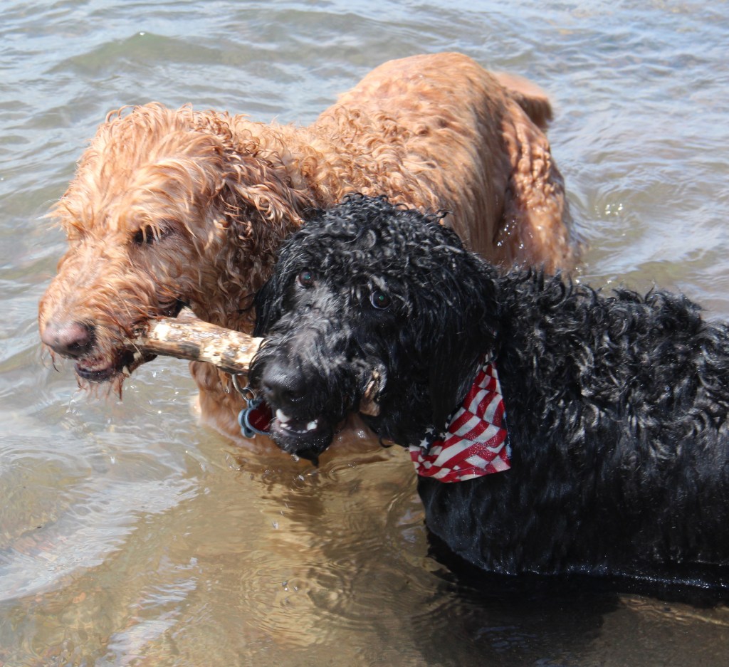 Lyle, the black doodle above, has a neat trick: he likes to dive for rocks. We didn’t understand at first, but as you’ll see in the following slideshow, he likes to sort through the rocks underwater with his paws, and pull one where he can get it, then sticks his head underwater!
