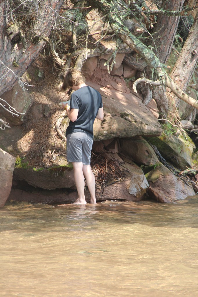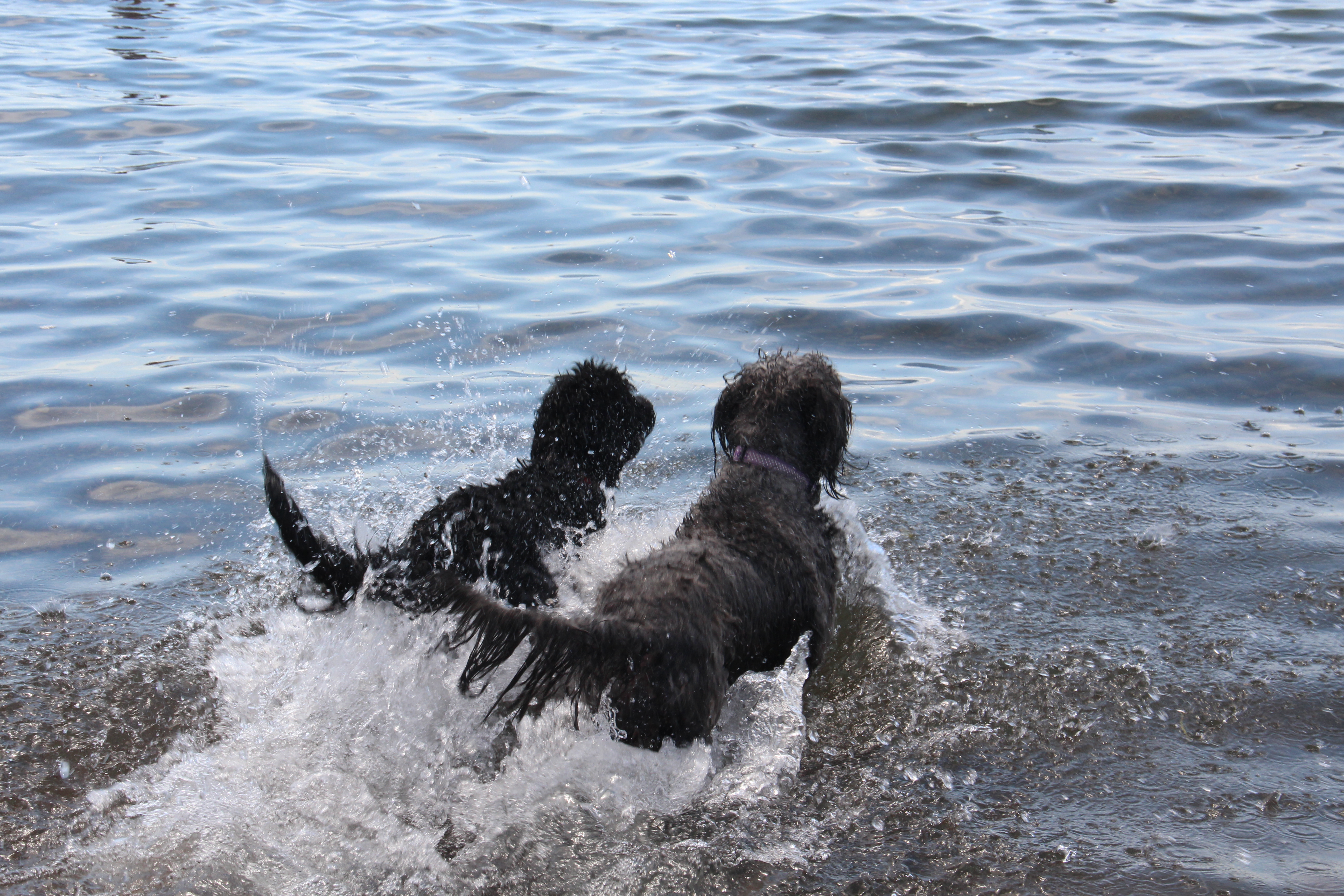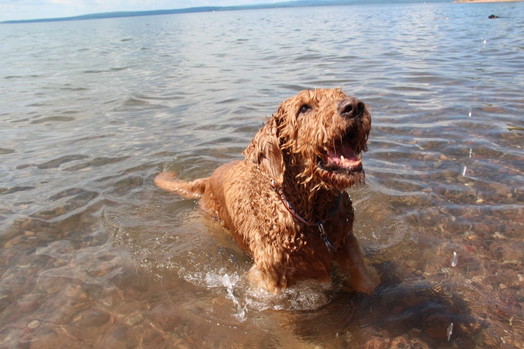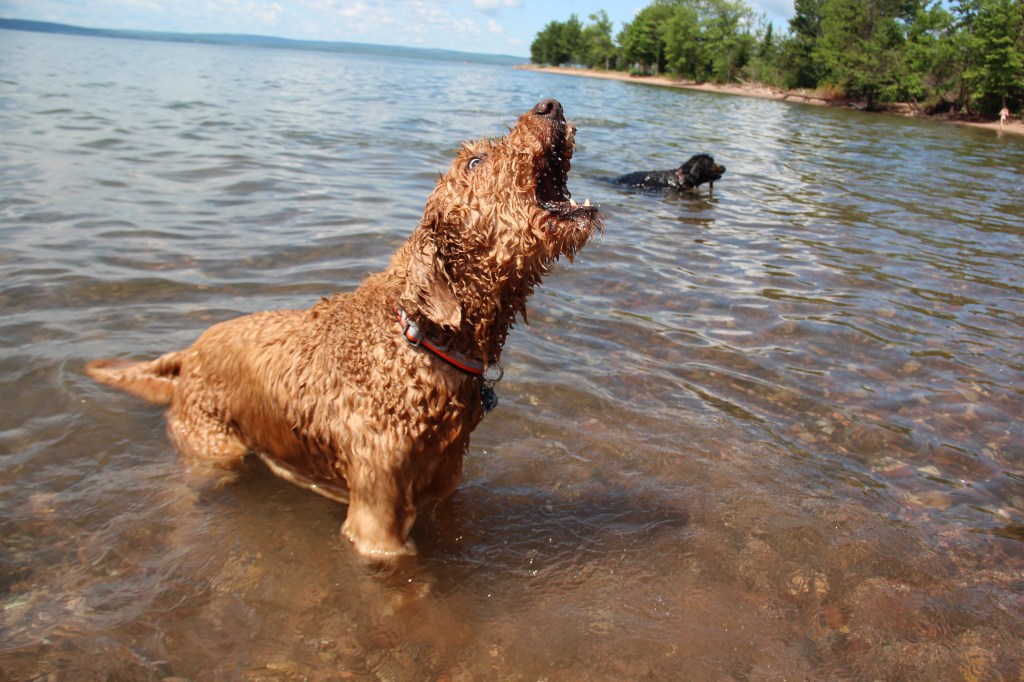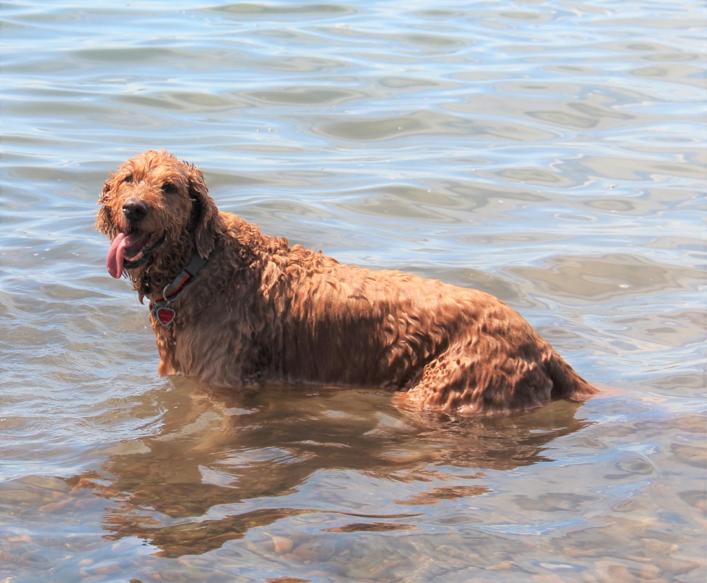 Lyle, the black doodle above, has a neat trick: he likes to dive for rocks. We didn’t understand at first, but as you’ll see in the following slideshow, he likes to sort through the rocks underwater with his paws, and pull one where he can get it, then sticks his head underwater!