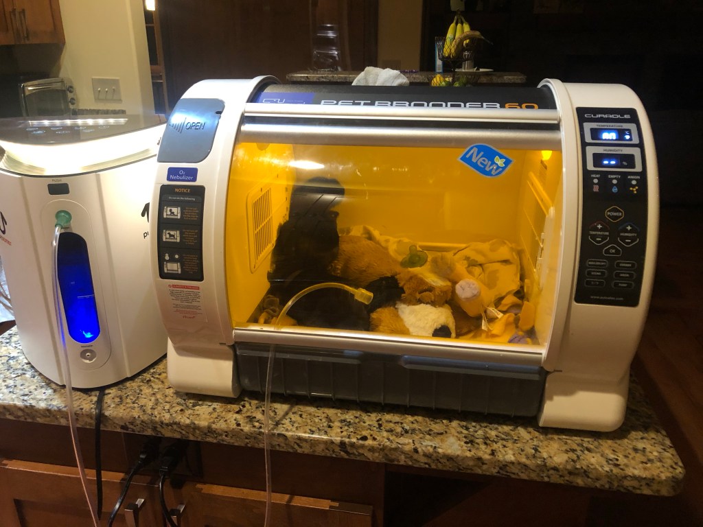 She came home and both puppies promptly moved into an oxygen chamber that took up half my kitchen counter.