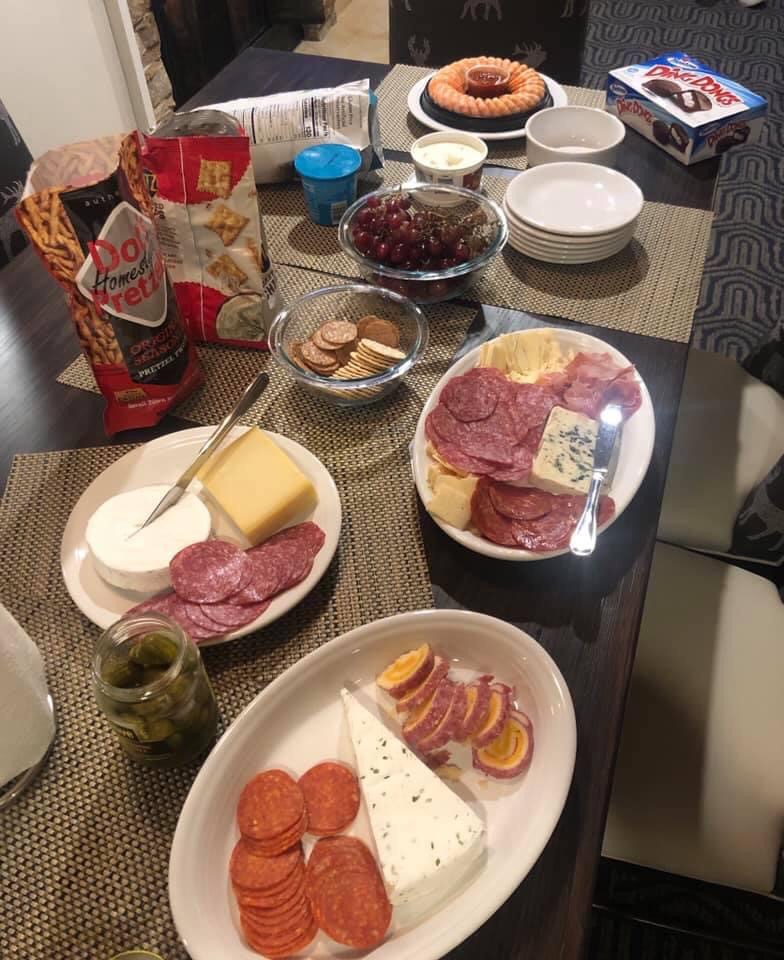 We needed a night in, so the couples decided to pool our resources and meet in our condo. Clearly, we had similar tastes, as we each brought meat and cheese platters to the party.