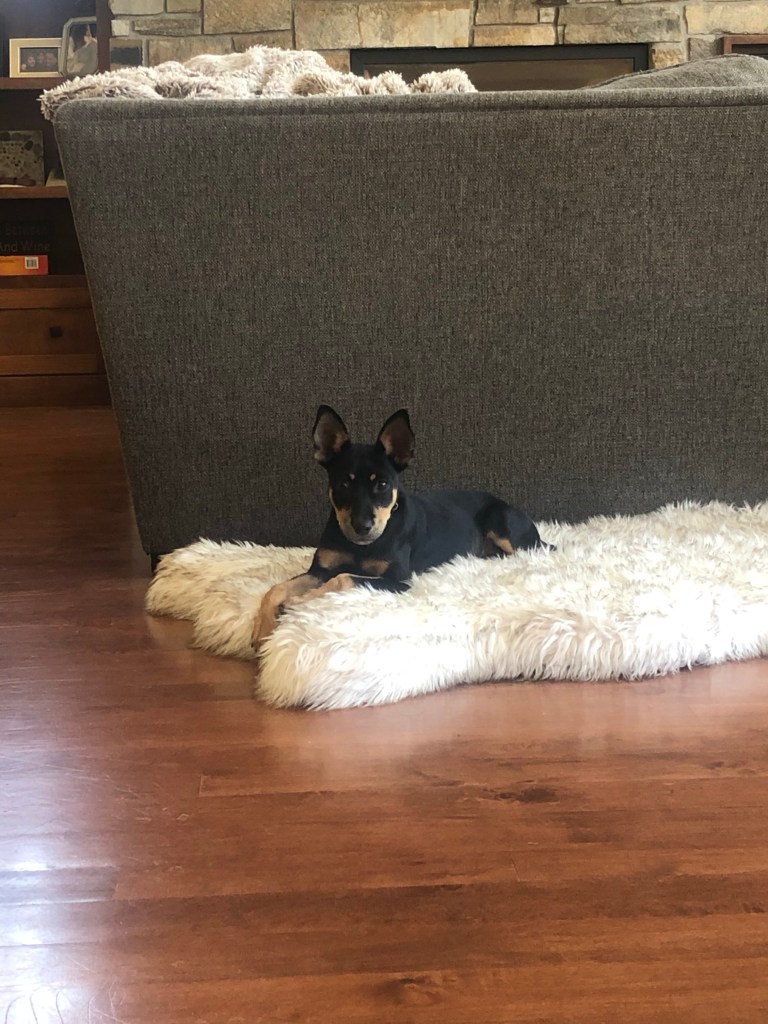 Periodically I would come in the room and lay down prone on the floor, stick my hand in the kennel, and not look at them. It took awhile, but eventually Trillium, the black one, would do a cautious sniff — then a scurry.
