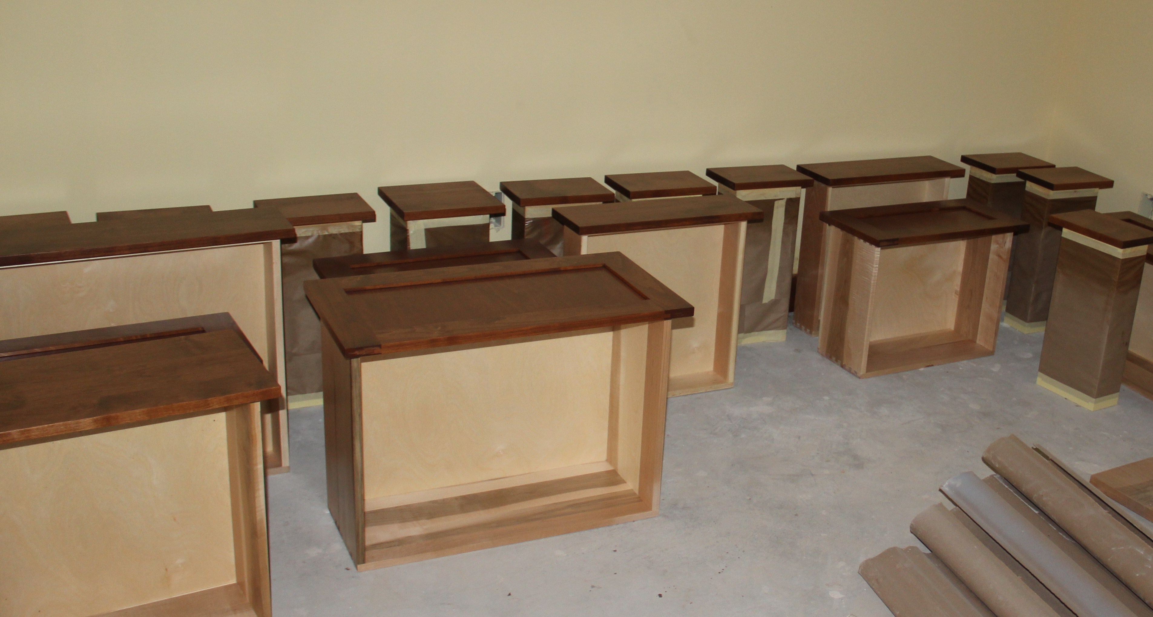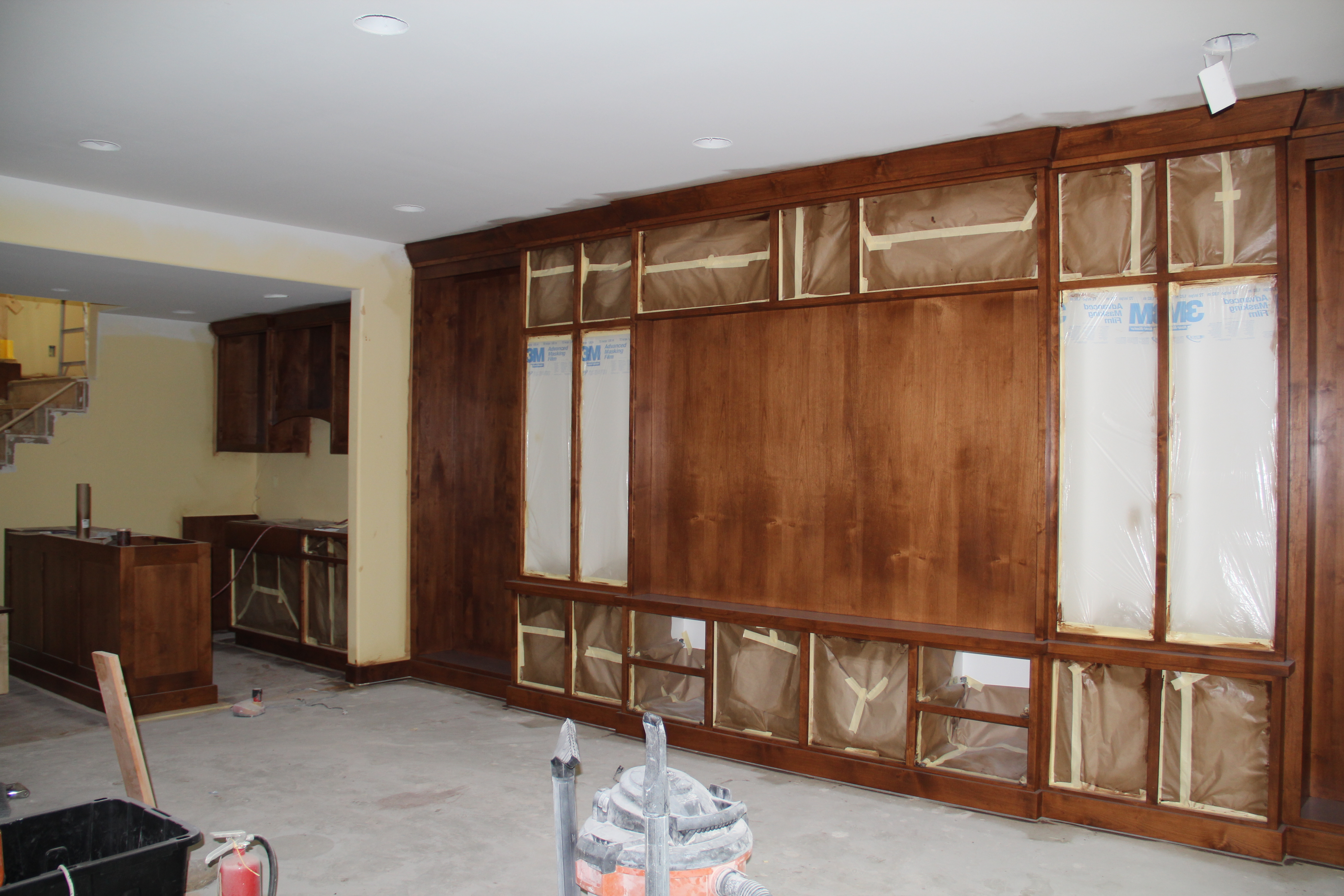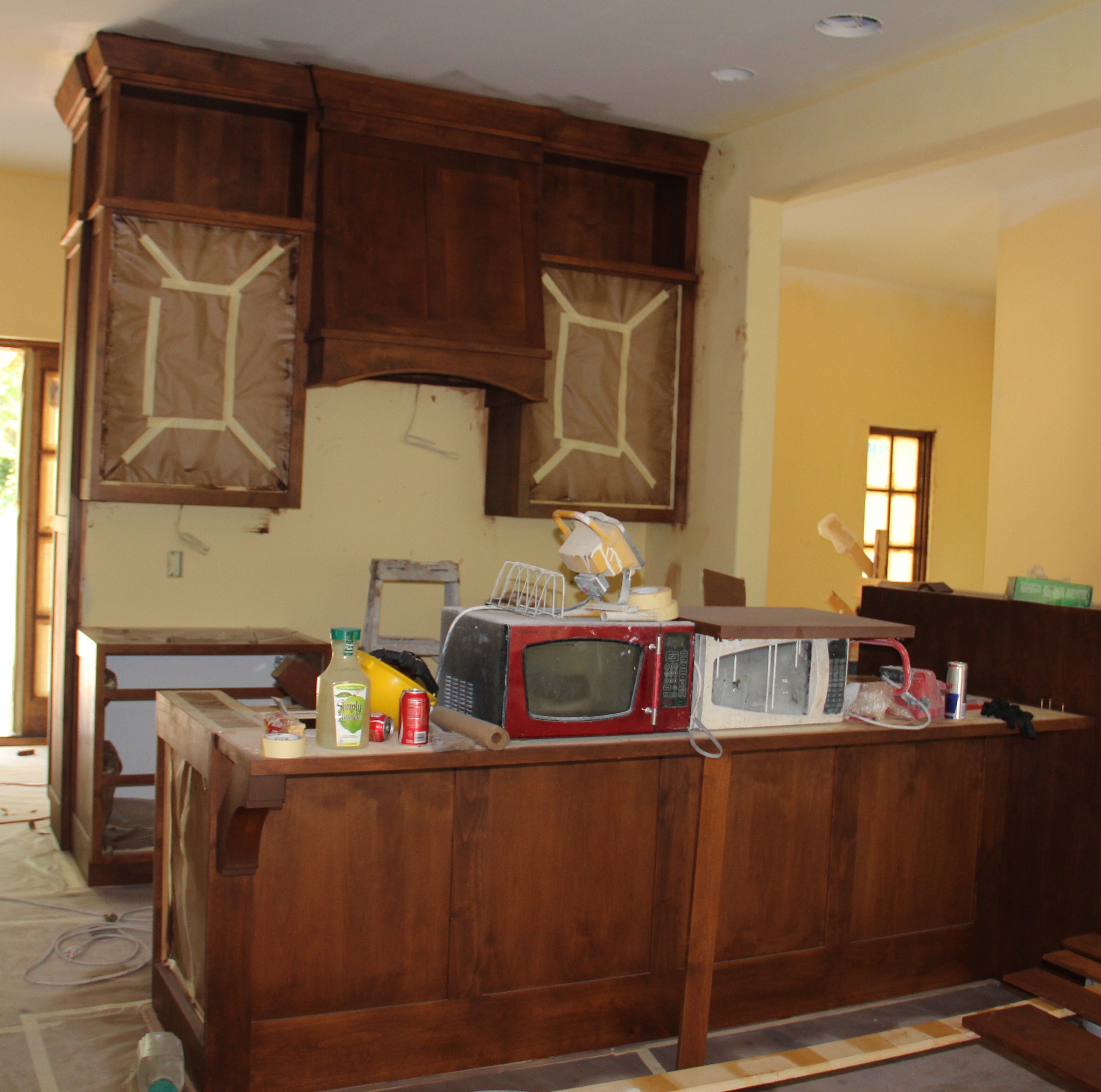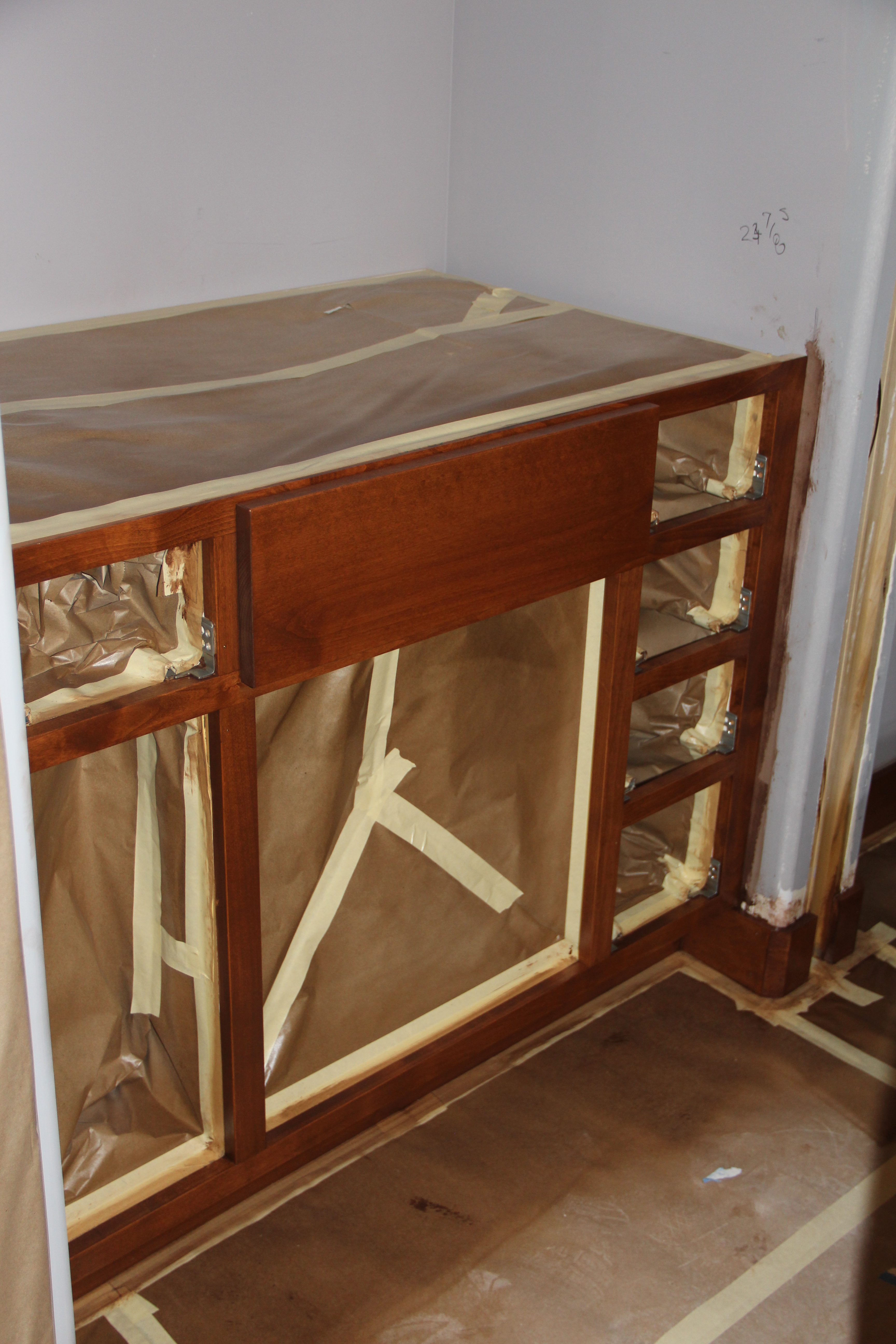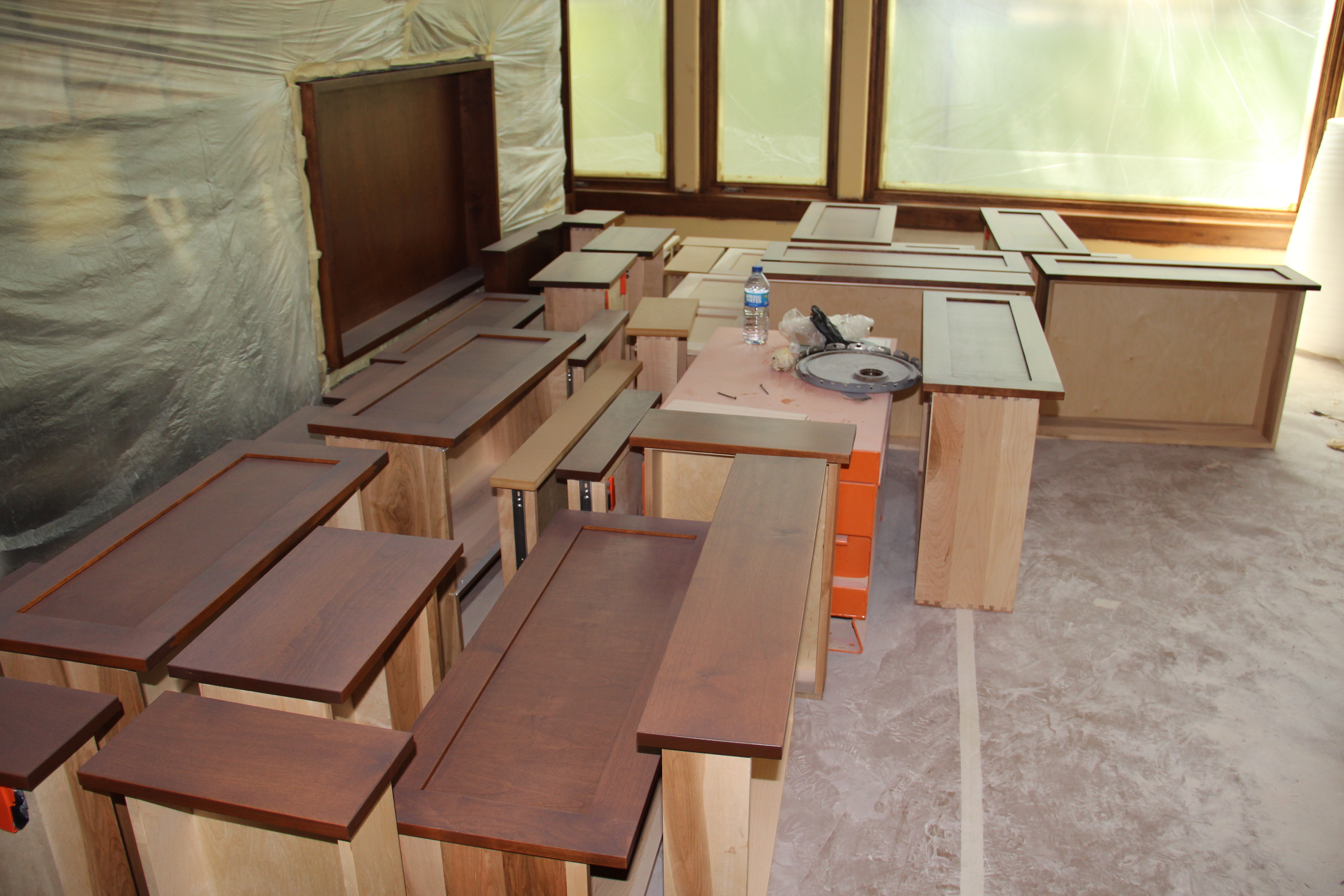Super Bill warned me not to go in, but I couldn’t resist. I had to see the cabinetry being stained. It was so pretty! And the pink elephants I was seeing after I spent 10 minutes in the polyurethane dome agreed with me.
